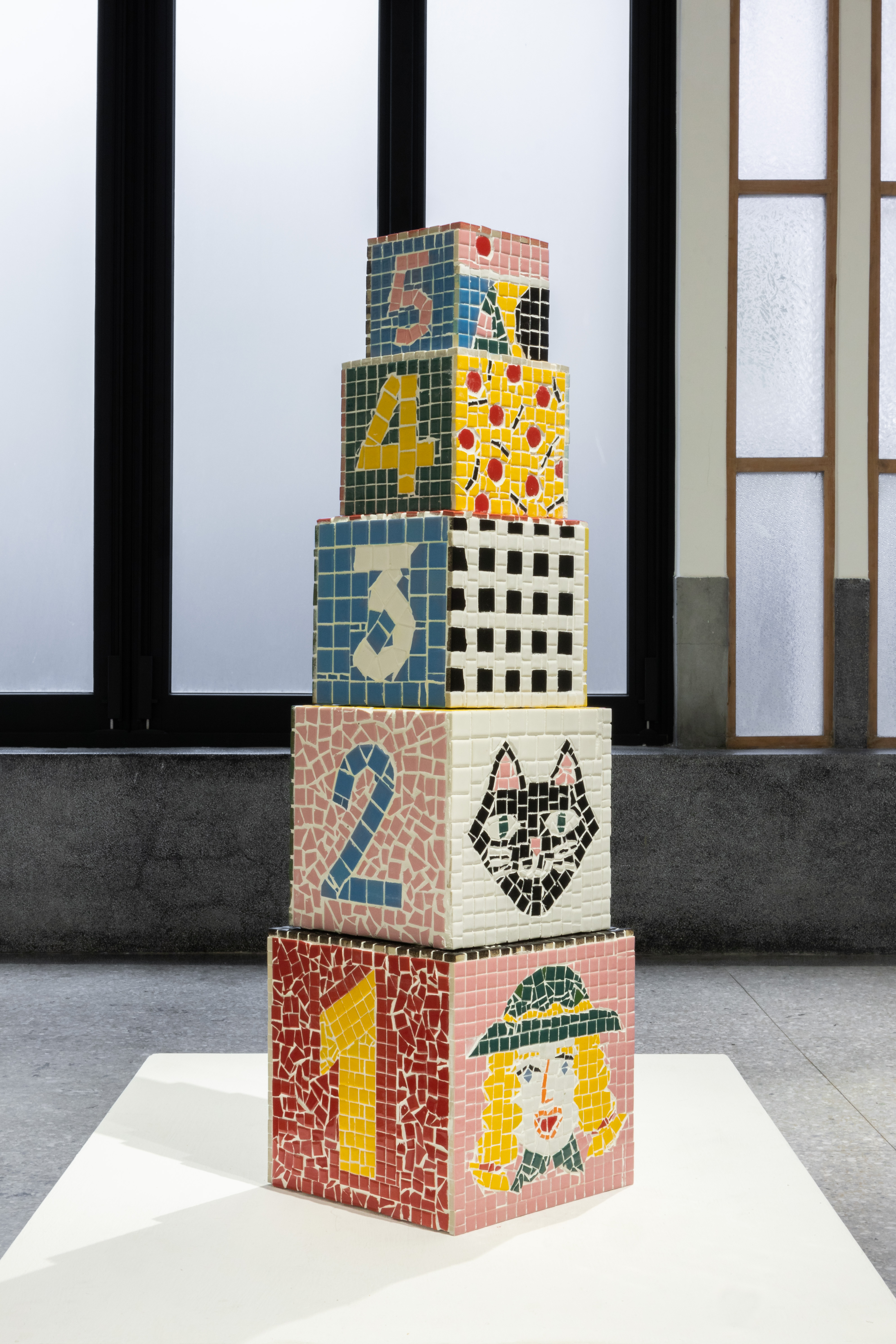 The Mosaic Cubes is a series of handmade sculptures inspired by interpretations of toddler toys. These sculptures explore the influential elements, including symbols, numbers, shapes, and images, that play a vital role in a young toddler's learning process. Each piece is meticulously crafted by hand and adorned with broken ceramic tiles. These sculptures were exclusively exhibited at Pon Ding Gallery in 2020.
