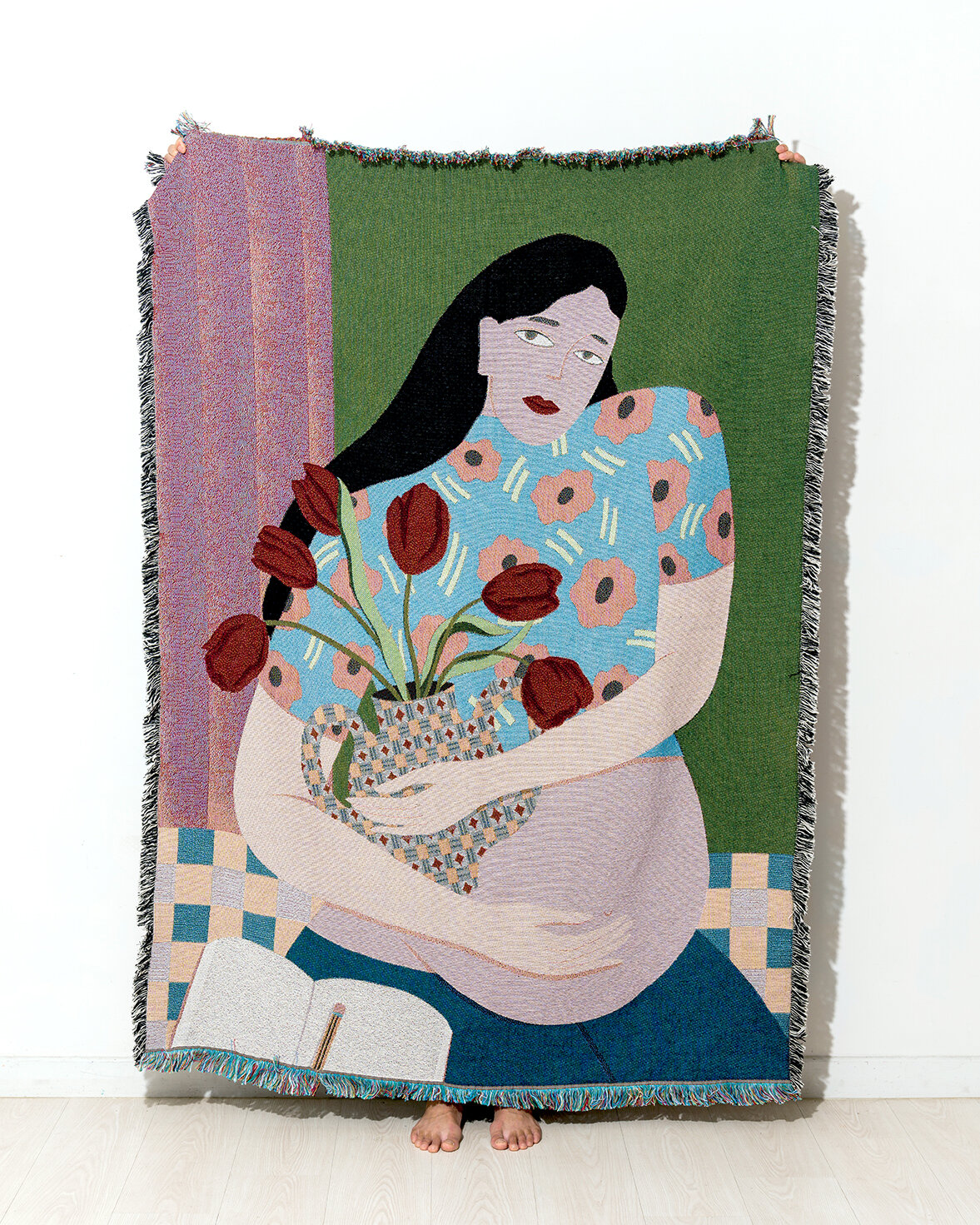 [The Pregnant Woman] woven cotton throw was a painting of Eszter and a collaborative project with Pon Ding Gallery exhibited at a duo show of Eszter Chen and Hsiao Ron Cheng “Marmee”. This woven blanket is crafted with care from recycled cotton, making them a sustainable and eco-friendly addition to any home. Woven in the USA, the lightweight material is perfect for using as a couch cover, bed cover, picnic rug, or wall art.