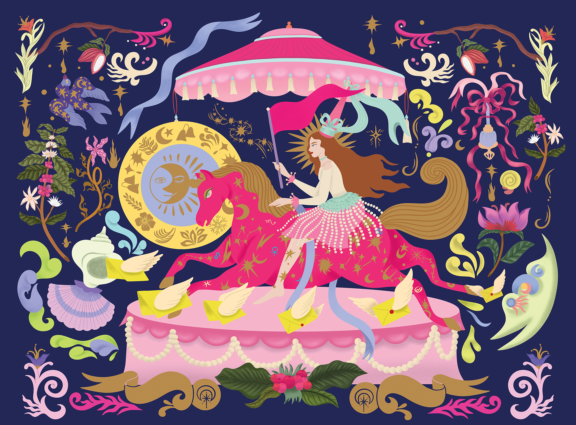 A surreal, symbolic collaboration with Starbucks for the Year of the Horse. I created the core visual and extended ten variations into a collectible gift set series. Infused with Eastern dreamscape elements, cosmic motifs, and blessings in motion, the artwork invites viewers on a seasonal journey toward hope and renewal. The full series blends fantastical storytelling, intricate linework, and modern visual rituals to mark a luminous start to the new year.